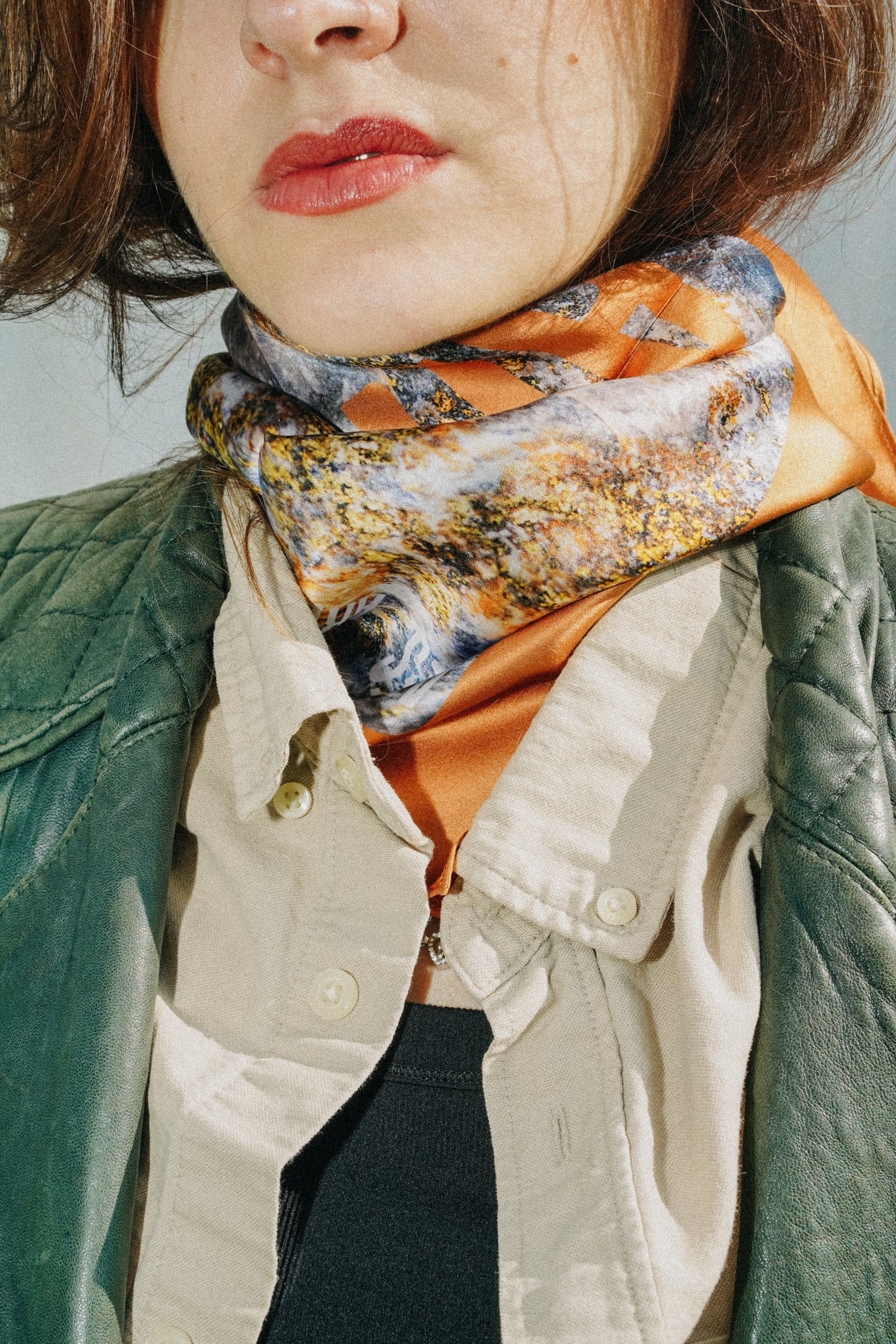 - Un carré de 64 cm x 64 cm fabriqué à partir de 100 % de soie certifiée Oeko-Tex, imprimé avec une encre GOTS et fini avec un ourlet mouchoir 'Haute Couture' de 3 mm.