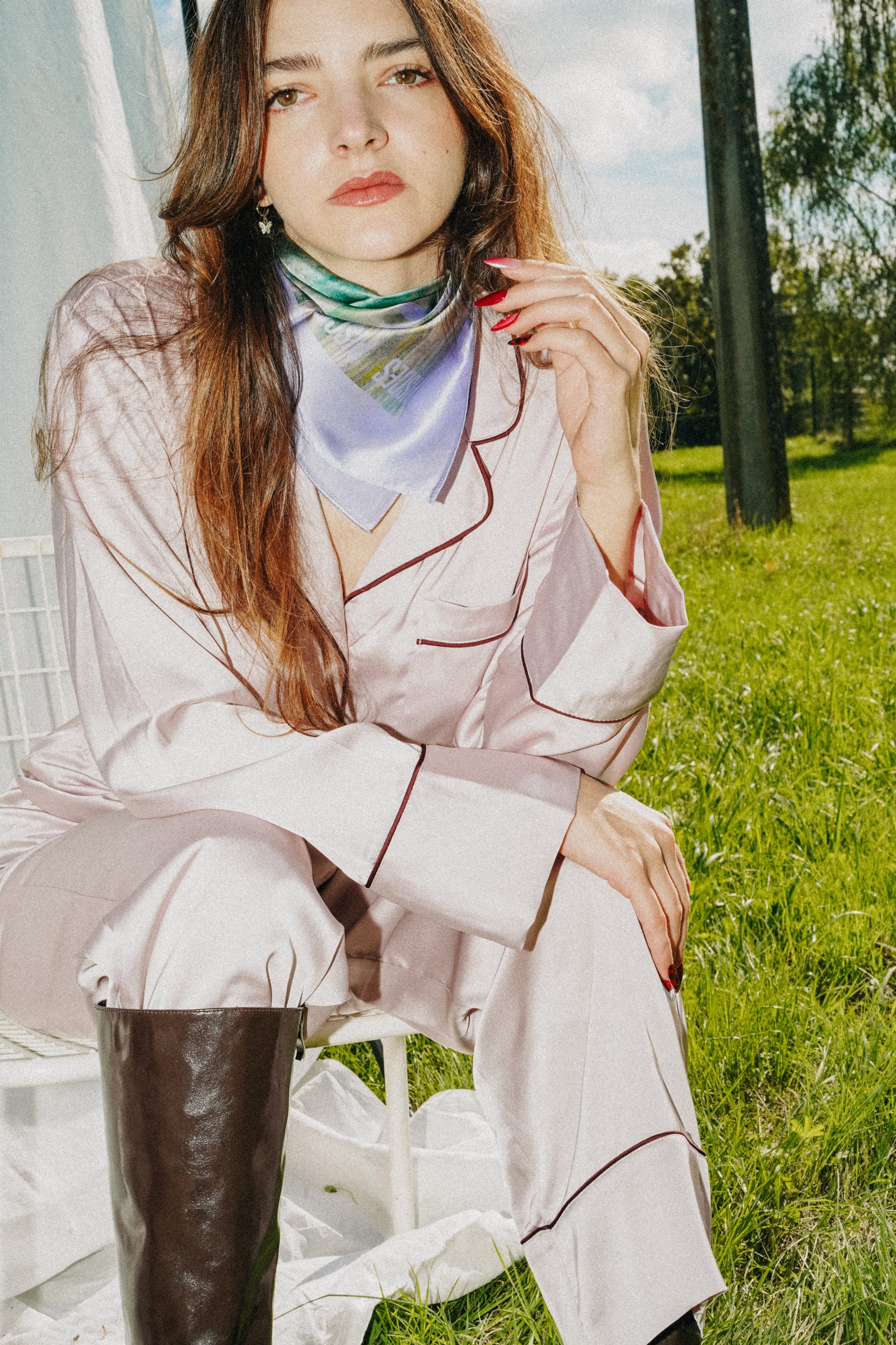 - Un carré de 64 cm x 64 cm fabriqué à partir de 100 % de soie certifiée Oeko-Tex, imprimé avec une encre GOTS et fini avec un ourlet mouchoir 'Haute Couture' de 3 mm.
